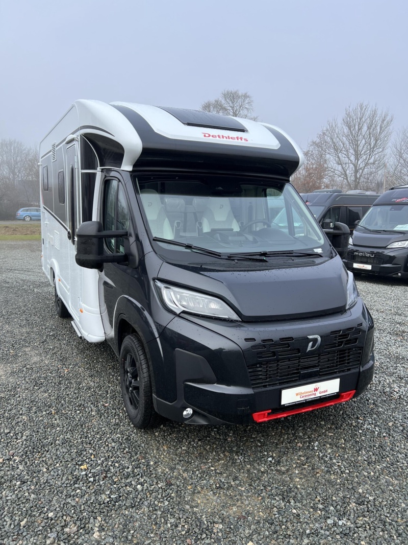 - Active-Paket T 6617 EB (Wohnraumtür mit Fenster inkl. Verdunkelung und Zentralverriegelung (inkl. Fahrerhaustür), Verdunklungsjalousien im Fahrerhaus, Light Moments: Indirekte Ambientebeleuchtung über den Dachstauschränken, Light Moments: Indirekte Wandflächen-Ambientebeleuchtung, Light Moments: Küchenrückwand beleuchtet, Light Moments: Verkleidete Sitztruhenwange mit indirekter Beleuchtung, Gemütliche L-Sitzgruppe mit freistehendem, absenkbarem Tischfuß und 2 integrierte 3-Punkt-Gurte, Bettumbau Einzelbetten zu Doppelbett, Außenfarbe Chassis Schwarz Metallic, Außendesign GT (Heckleuchtenträger mit schwarzem Diffusor, erweiterte Beklebung, Skidplate "rot"), Integrierte Einlinsen Rückfahrkamera, Vorbereitung SAT-Anlage, Vorbereitung Dach-Klimaanlage, Vorbereitung Solar, Duschrost, Dethleffs Naviceiver inkl. DAB+, Truck Navigation, Wireless Apple CarPlay und Android Auto, Textilleder-Wohnwelt Heron)